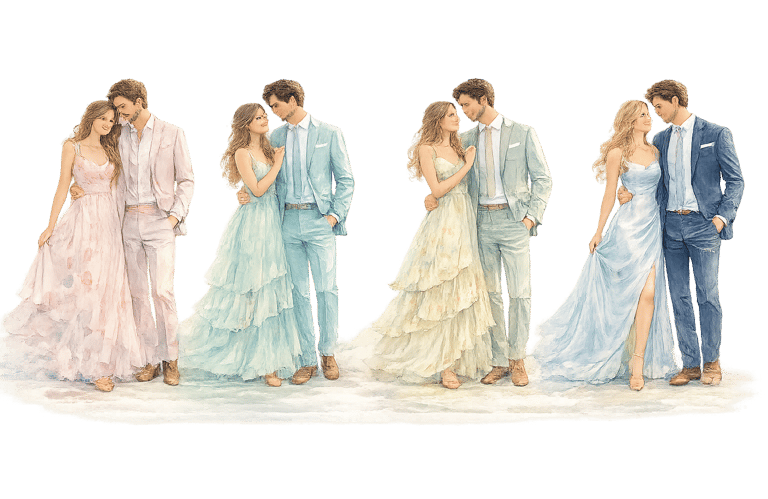We invite you to wear elegant flowing maxi dresses or refined garden-party ensembles. Please select footwear suitable for outdoor terrain, as stilettos may be tricky on the grass. Kindly avoid sage/pistachio green and navy blue, as these are the bridal party colours.
