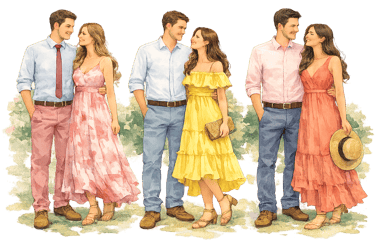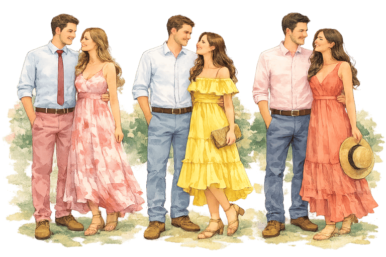 We invite you to wear elegant flowing maxi dresses or refined garden-party ensembles. Please select footwear suitable for outdoor terrain, as stilettos may be tricky on the grass. Kindly avoid sage/pistachio green and navy blue, as these are the bridal party colours.